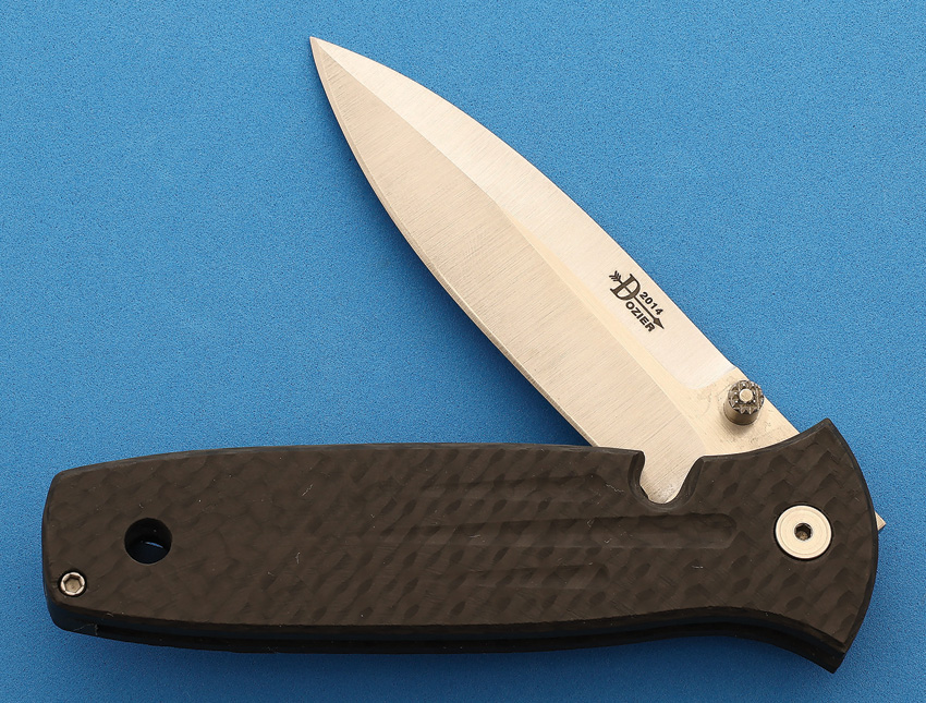 Bob Dozier “Thorn” Custom Folder. 4 9/16” closed linerlock. Satin finish D2 steel false edge spear point blade with thumb stud. Black carbon fiber handles with blue anodized titanium liner and pocket clip. Comes in zippered storage pouch.