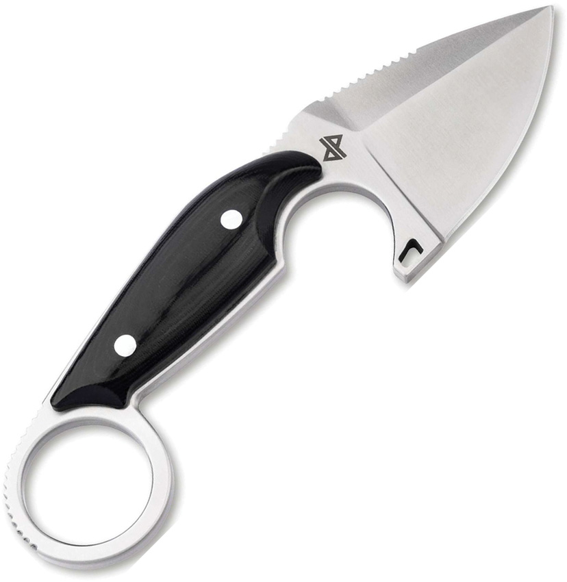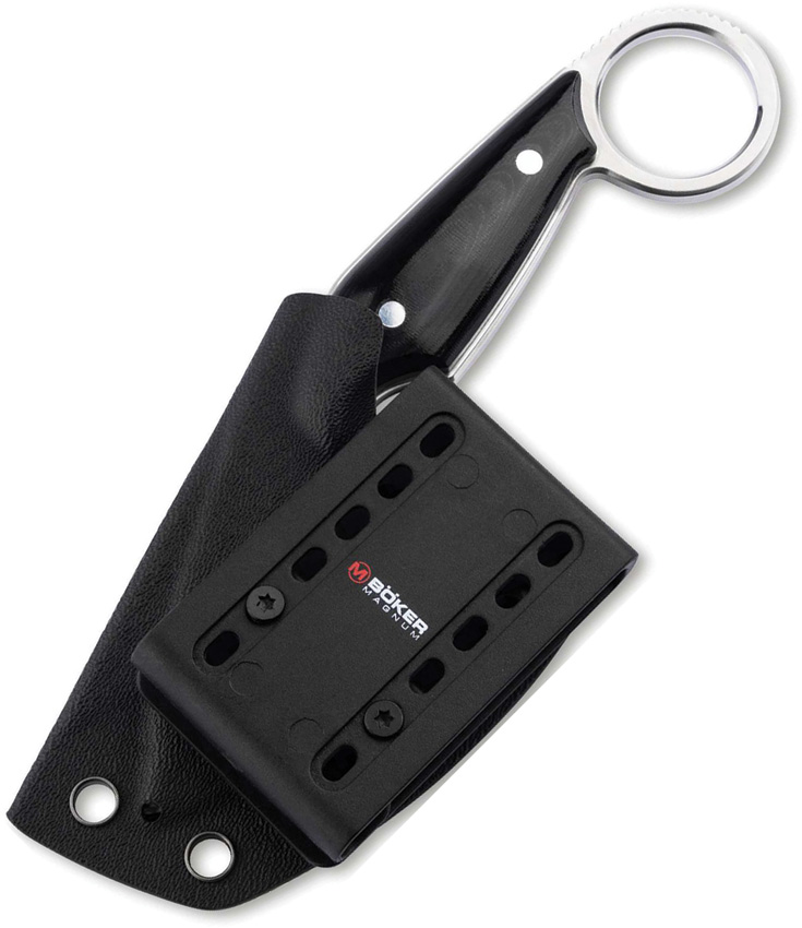 6.13″ (15.57cm) overall. 2.25″ (5.72cm) satin finish 440 stainless spear point blade. Black micarta handle. Full, extended tang. Finger ring. Black Kydex belt sheath. Boxed with hanging tab.