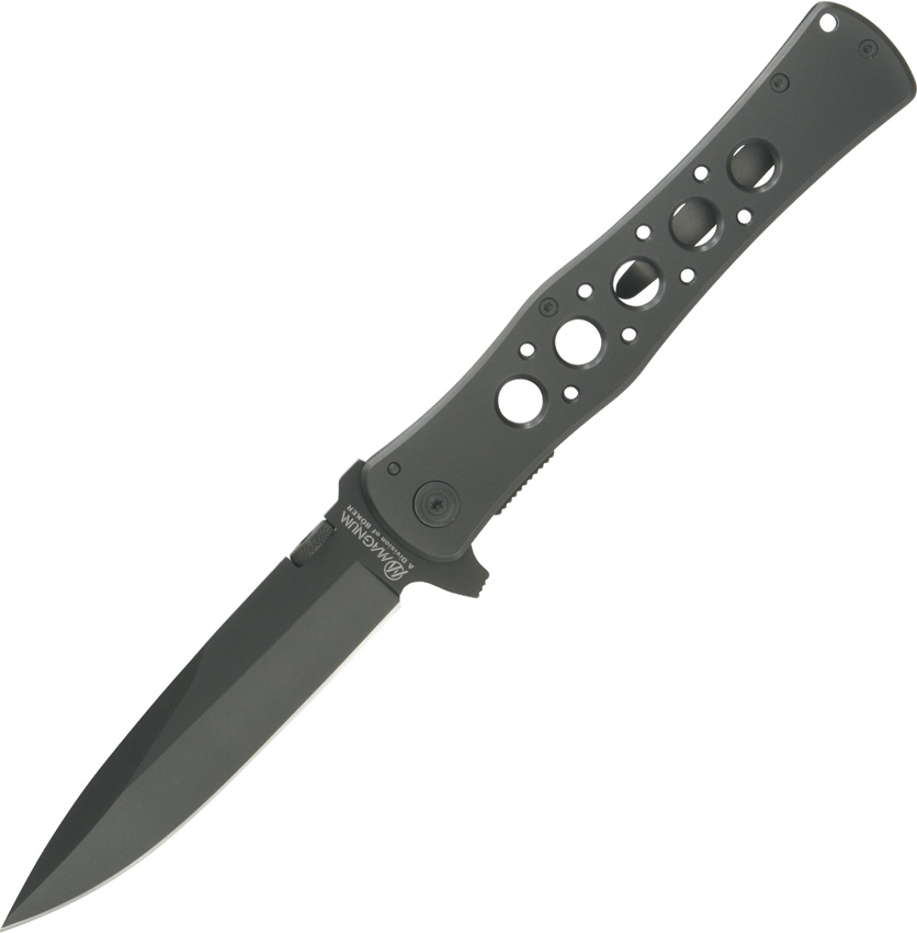 6″ closed. 5″ black finish 440 stainless blade. Gray 2Cr13 stainless handle. Extended tang. Thumb stud. Pocket clip.