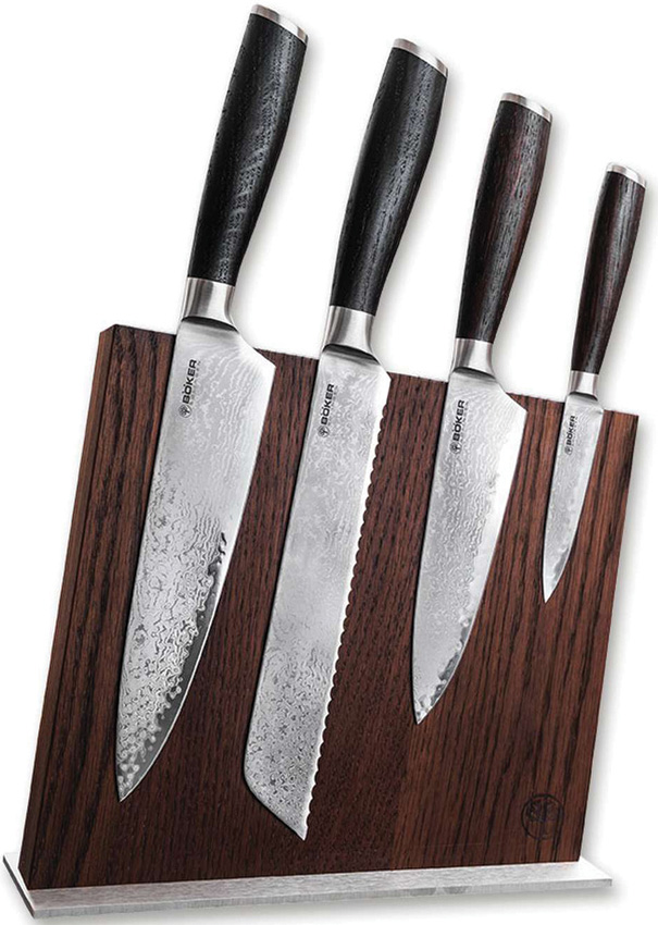 VG-10 Damascus steel blade. Brown wood handle. Includes: Pairing; Small Chef’s; Chef’s; Bread knife. Smoked oak magnetic storage block. Boxed.