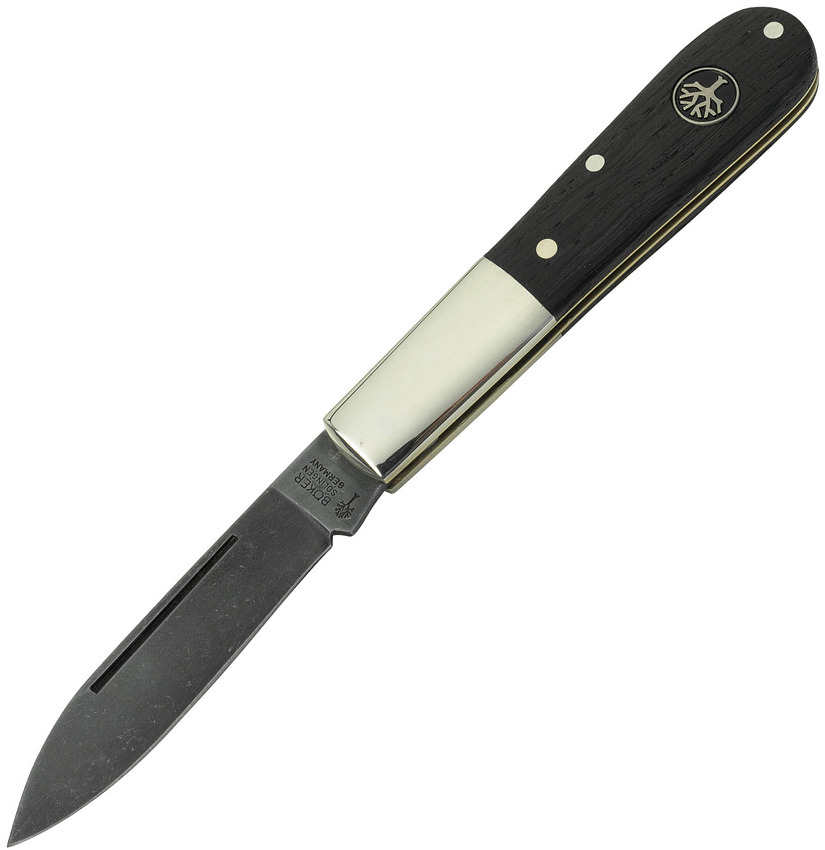 3.38″ (8.59cm) closed. 2.5″ (6.35cm) acid washed finish C67 carbon steel spear blade. Bog Oak handle. Nickel silver bolster(s). Inlay shield. Boxed.