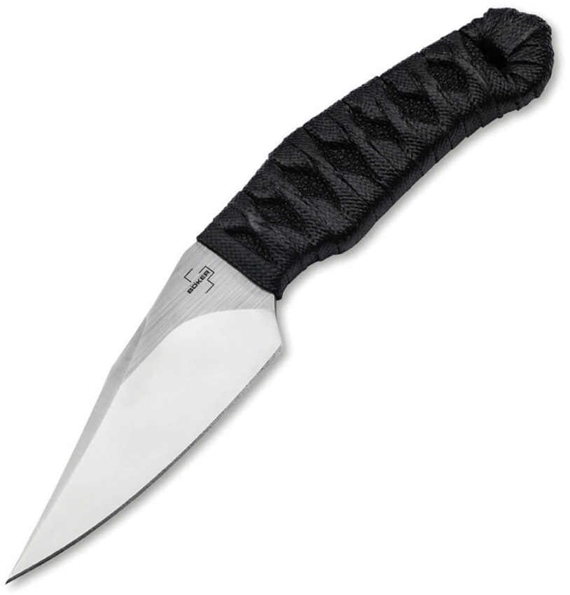 7.13″ (18.11cm) overall. 3.38″ (8.59cm) satin finish Nitro V steel clip point blade. Full tang. Tsuka-Ito handle wrapping made of black pearl fish skin with liners made of black ray skin underneath. Black Kydex sheath. Boxed.