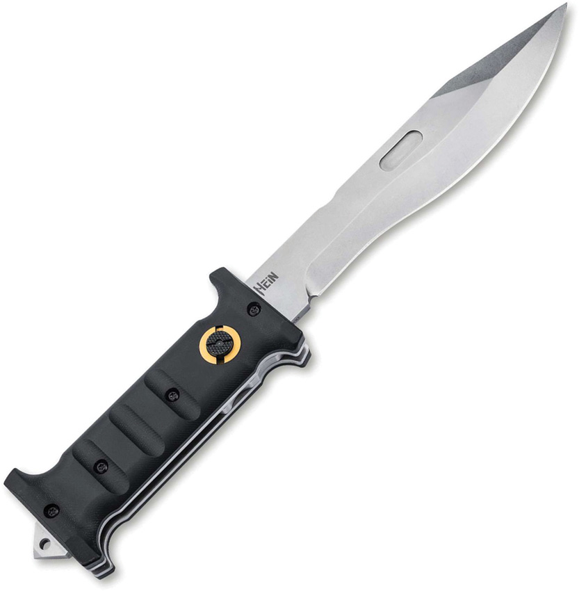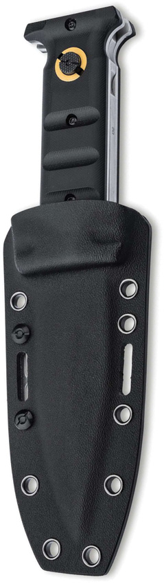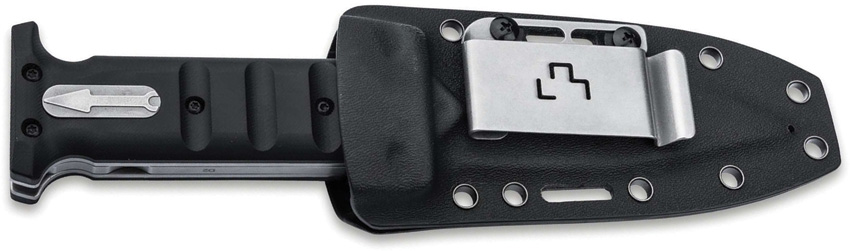 1.88″ (4.78cm) overall. 7.25″ (18.42cm) satin finish D2 tool steel blade. Black G10 handle. Glass breaker. Lanyard hole. Closed position: 4.75″ blade length. Extended position: 7.3″ blade length. Cross bolt locks the blade securely in both open and closed positions and can be screwed into the handle. Black Kydex belt sheath. Boxed.