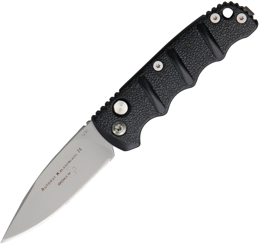 Kalashnikov Mini Buttonlock. 3.25″ closed. 2.5″ bead blast finish AUS-8 stainless blade. Black FRN handle. Lanyard hole. Pocket clip.
