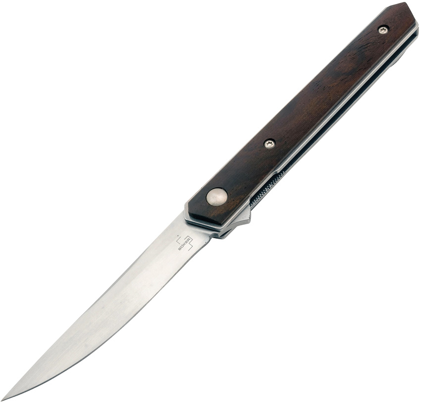 4.13″ (10.49cm) closed. 3.13″ (7.95cm) satin finish VG-10 stainless blade. Cocobolo wood handle. Extended tang. Pocket clip. Designed by Lucas Burnley. Boxed.