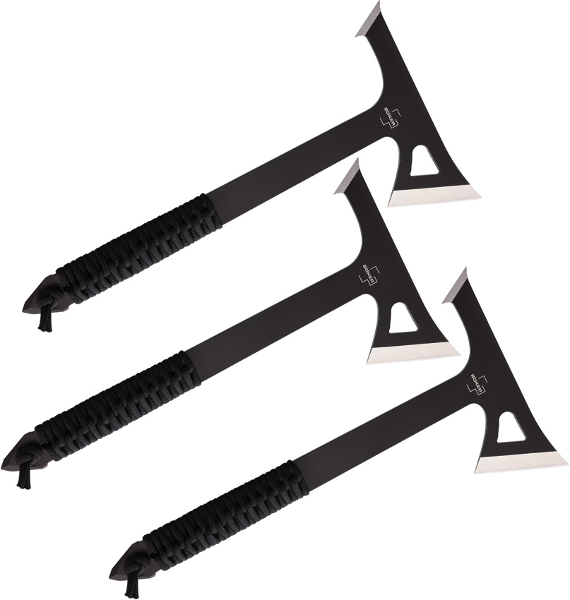 11″ overall. 5.25″ black finish 3Cr13 stainless axe head with 2.38″ cutting edge. Black cord wrapped handle. Lanyard hole. Set of three. Sharpened end. Includes paper targets. Black nylon belt sheath. Boxed.