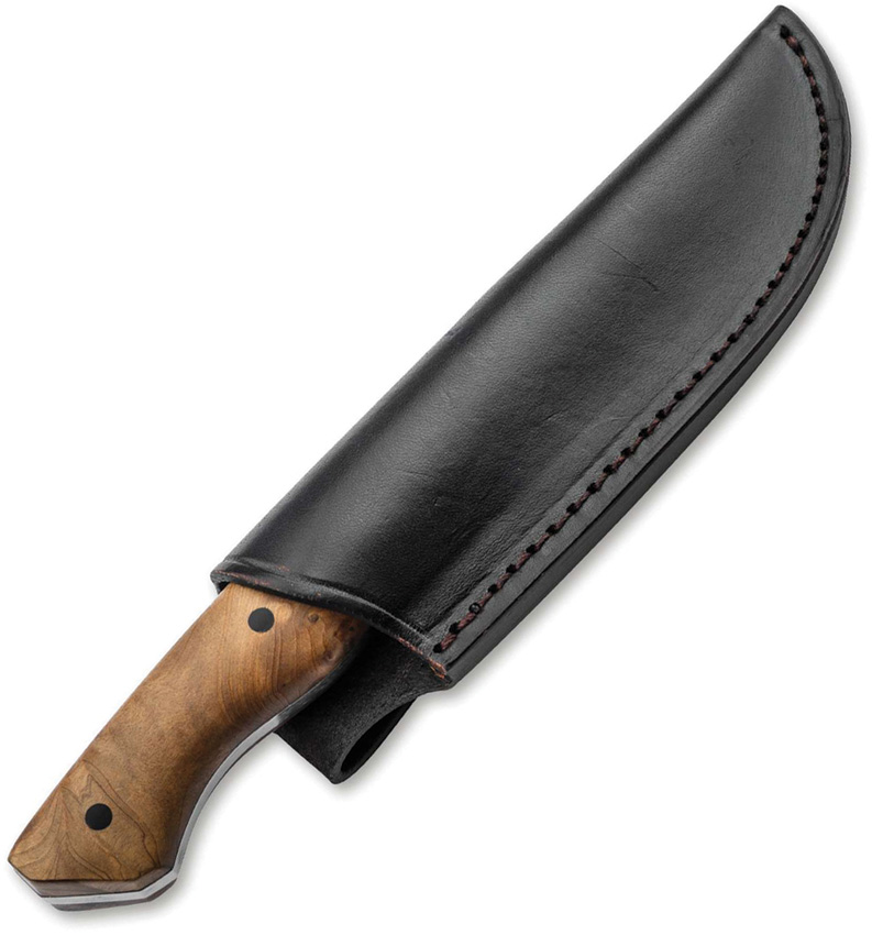 9.25″ (23.5cm) overall. 4.5″ (11.43cm) two-tone finish D2 tool steel clip point blade. Burl wood handle. Full tang. Black leather belt sheath. Boxed.