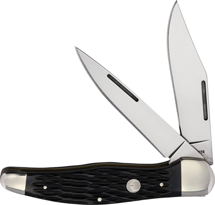 5.25″ (13.34cm) closed. Mirror finish 1095HC steel clip and pen blades. Black jigged bone handle. Nickel silver bolster(s). Inlay shield. Brown leather belt sheath. Boxed.