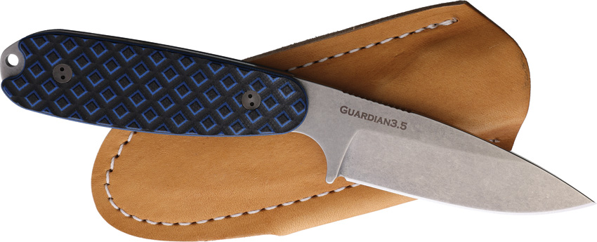 7.63″ (19.38cm) overall. 3.75″ (9.53cm) stonewash finish saber ground Bohler N690 stainless drop point blade. Black and blue sculpted G10 handle. Full, extended tang. Lanyard hole. Brown leather belt sheath. Boxed.