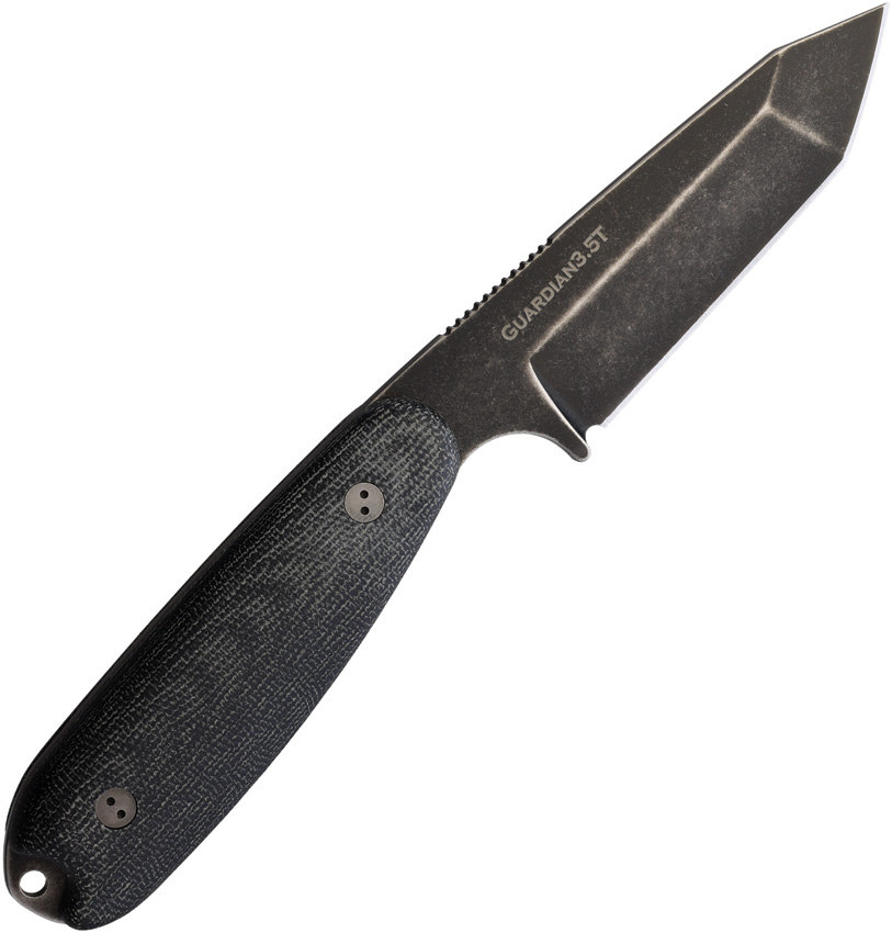 7.63″ (19.38cm) overall. 3.75″ (9.53cm) Nimbus finish Bohler N690 stainless tanto blade. Black canvas micarta handle. Full, extended tang. Lanyard hole. Brown leather belt sheath. Boxed.