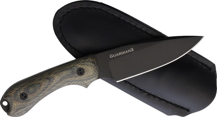 6.75″” (17.15cm) overall. 3.5″” (8.89cm) black Bohler N690 stainless blade. Camo G10 handle. Full, extended tang. Lanyard hole. False edge grind. Leather sheath included. Boxed.