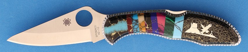 Brian Yellowhorse Eagle Mountain Spyderco Delica. Model SC-11P. 4 1/8” closed lockback. VG-10 steel standard edge blade with thumb hole pull. Stainless frame and pocket clip. Front handle onlay constructed of multi color stones and black and gold matrix with nickel silver eagle and mountain inlay. Fileworked border. Includes cardboard gift box and Brian Yellowhorse certificate.