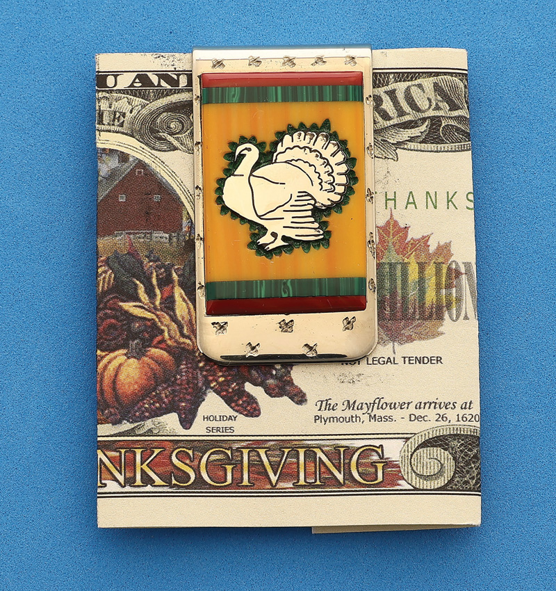 Brian Yellowhorse Wild Turkey Money Clip. Measures 1 ¾” x 1”. Polished stainless steel construction. Front side features stone onlay consisting of red coral, green malachite and yellow spiny oyster with nickel silver wild turkey inlay. Signed and serial numbered. Colorful American flag design cardboard gift box.Measures 1 ¾” x 1”. Polished stainless steel construction. Front side features stone onlay consisting of red coral, green malachite and yellow spiny oyster with nickel silver wild turkey inlay. Signed and serial numbered. Colorful American flag design cardboard gift box.