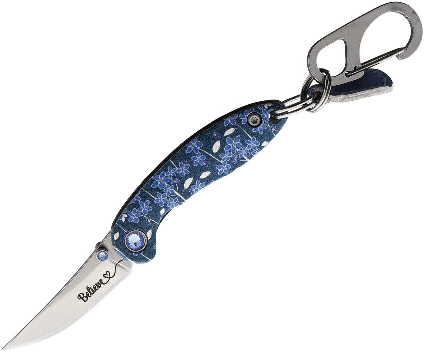 2.25″ (5.72cm) closed. 1.5″ (3.81cm) mirror finish stainless clip point blade. Aluminum handle. Attachment clip. Keyring. Blade etching. Thumb stud. Black and purple flower artwork on handle. Clam packed.