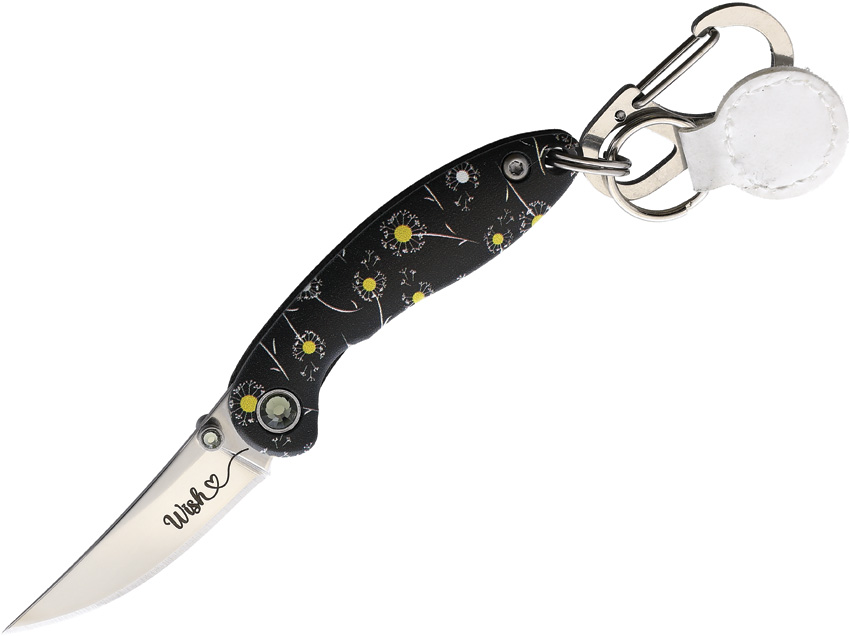 2.25″ (5.72cm) closed. 1.5″ (3.81cm) mirror finish stainless clip point blade. Aluminum handle. Attachment clip. Keyring. Blade etching. Thumb stud. Black and yellow flower artwork on handle. Clam packed.