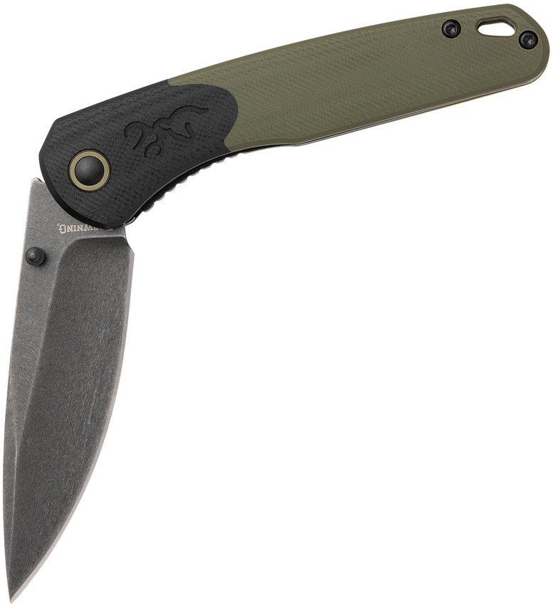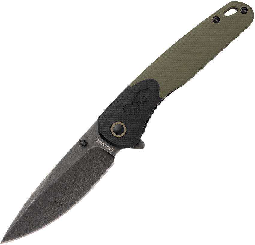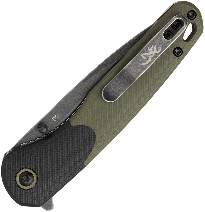 4.25″ (10.8cm) closed. 3.25″ (8.26cm) black stonewash finish D2 tool steel drop point blade. Black and OD green G10 handle. Thumb stud. Extended tang. Lanyard hole. Pocket clip. Boxed.