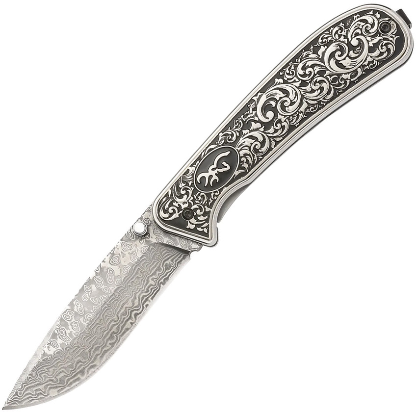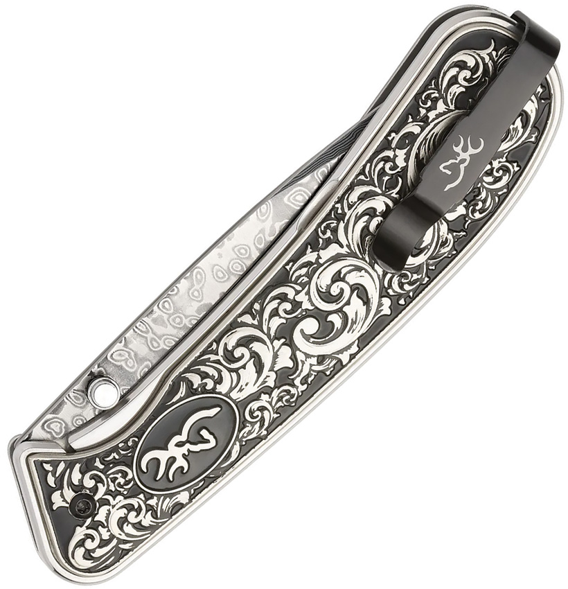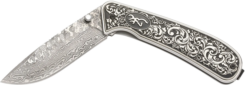 4.25″ (10.8cm) closed. 3.5″ (8.89cm) Damascus steel drop point blade. Stainless handle. Thumb stud. Pocket clip. Scrollwork on handle. Boxed.