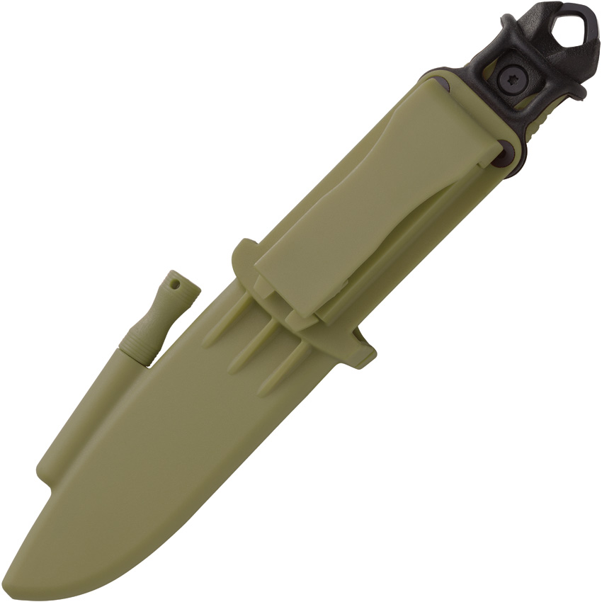 8.5″ (21.59cm) overall. 4″ (10.16cm) black oxide coated 7Cr17MoV stainless drop point blade. Black polymer handle with green rubber insert. Full, extended tang. Lanyard hole. Sparking bevel on blade spine. Sheath has integrated fire starting flint. Green polymer belt sheath. Boxed.