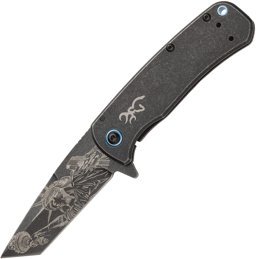 3.63″ (9.22cm) closed. 2.63″ (6.68cm) black stonewash finish stainless talon blade. Black stonewash finish stainless handle. Extended tang. Lanyard hole. Pocket clip. Statue of Liberty blade artwork. Boxed.