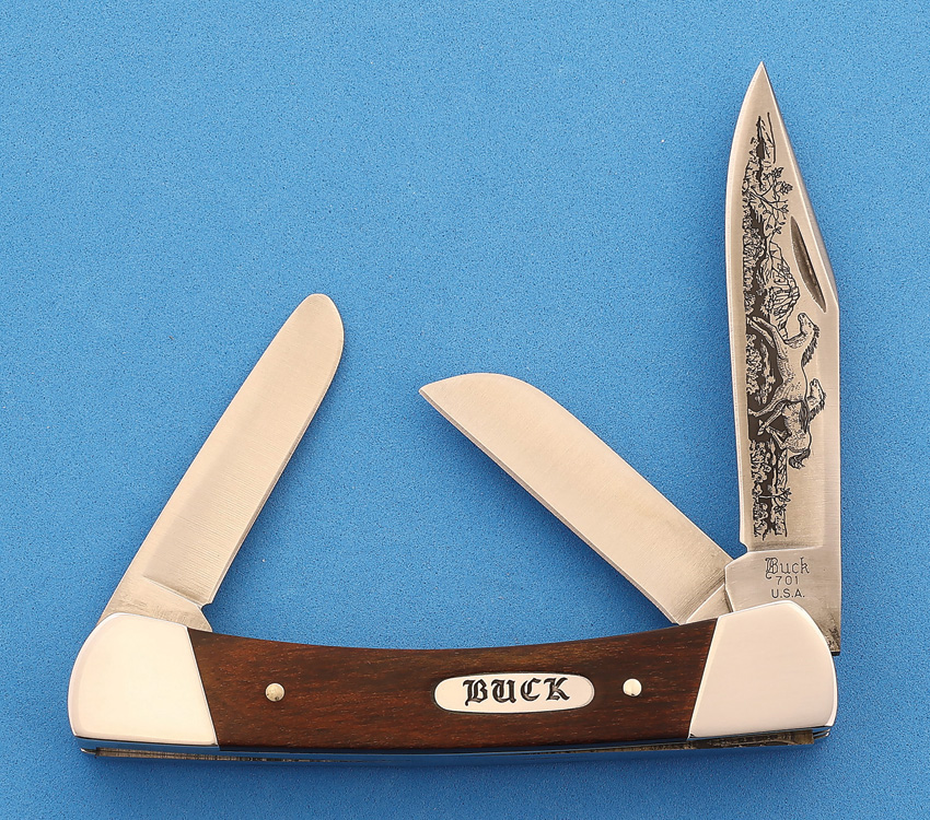 Buck Aurum Etch Bronco. Model 701. 3 3/4” closed 3 blade stockman pattern. Satin finish clip, sheepsfoot and spey blades. Master blade features detailed etch of wild horses by Aurum. Wood handles with polished stainless bolsters. Serial numbered. Produced in 1979. Includes original hardshell velvet lined presentation case.