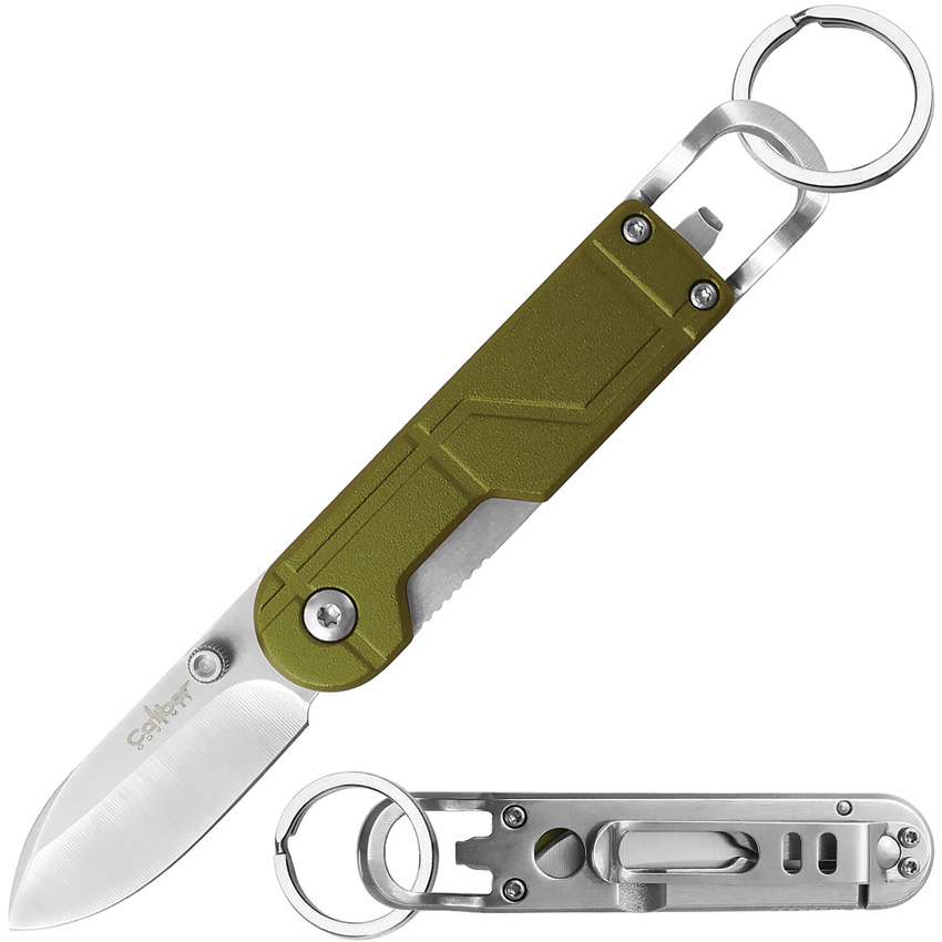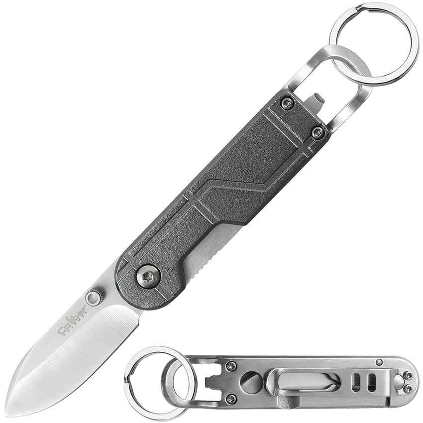 4″ (10.16cm) closed. 2″ (5.08cm) satin finish stainless blade. Orange aluminum handle. Bottle opener. Pocket clip. Keyring. Thumb stud. 12 pieces. Cardboard countertop display. Boxed.