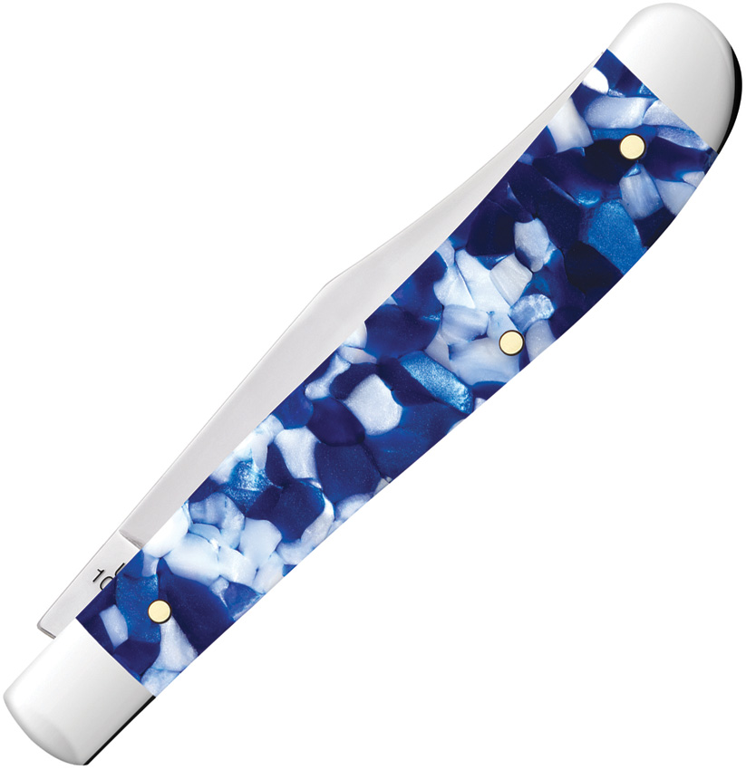 101048 SS pattern. 4.13″ (10.49cm) closed. Mirror finish stainless clip blade. Blue Crackle Kirinite handle. Nickel silver bolster(s). Inlay shield. Boxed.