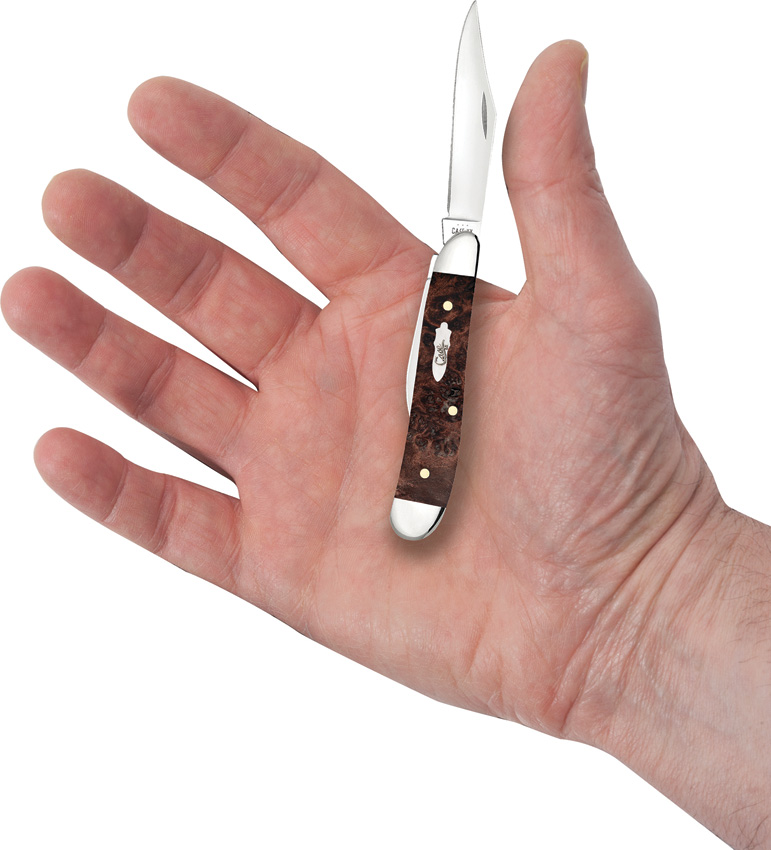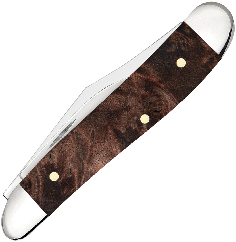 7220 SS pattern. 2.88″ (7.32cm) closed. Mirror finish stainless clip and pen blades. Brown maple burl wood handle. Nickel silver bolster(s). Inlay shield. Boxed.