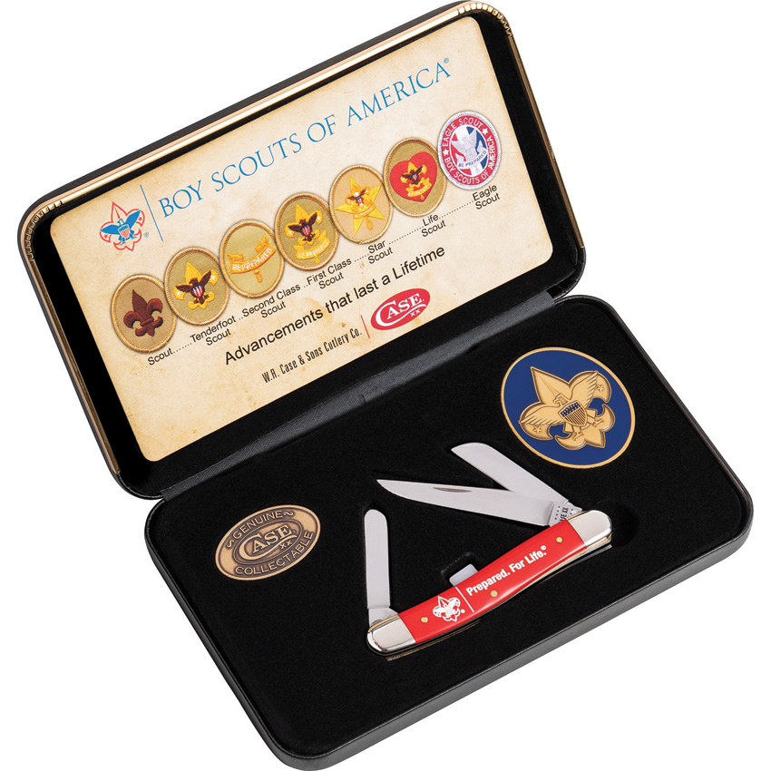 4318 SS pattern. 3.63″ (9.22cm) closed. Mirror finish stainless clip, sheepsfoot, and spey blades. Red smooth synthetic handle. Nickel silver bolster(s). BSA Prepared for Life handle embellishment. Gift boxed.