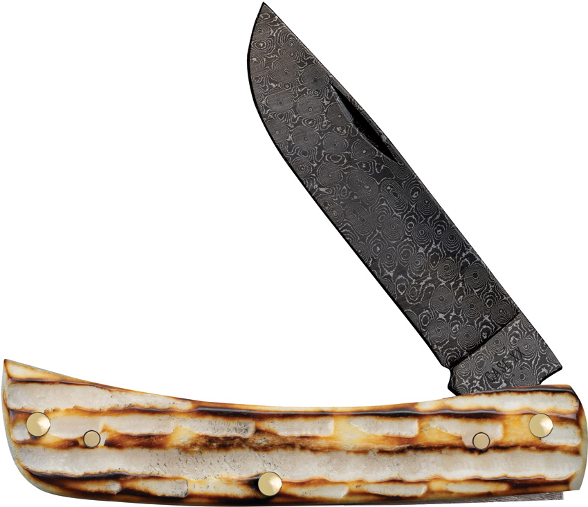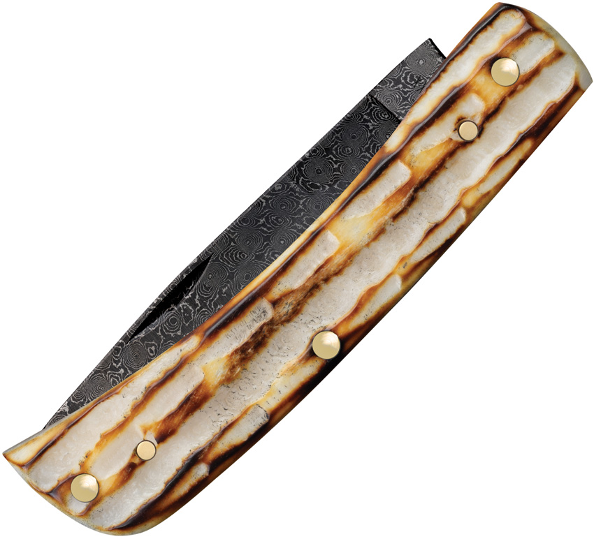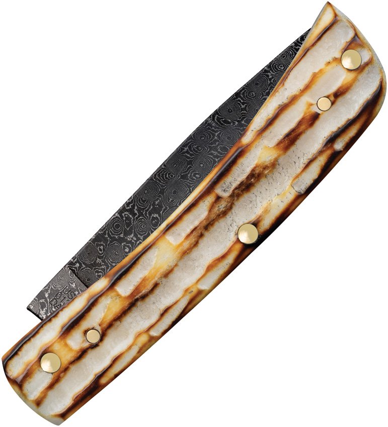 6137 DAM pattern. 3.63″ (9.22cm) closed. Damascus steel skinner blade. Burnt Deep Canyon jigged bone handle. Boxed.