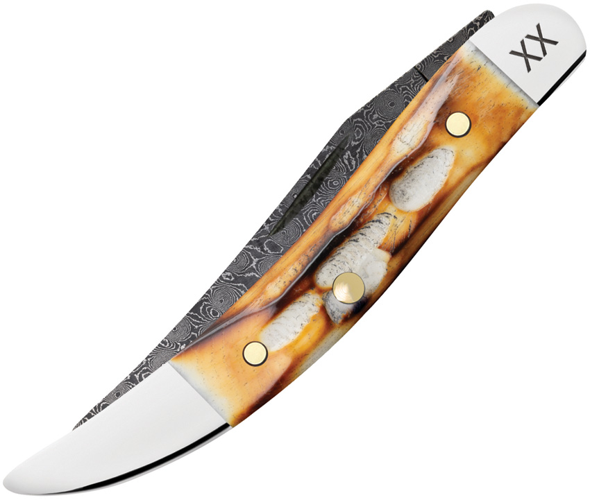 610096 DAM pattern. 3″ (7.62cm) closed. Damascus steel long clip blade. Burnt Deep Canyon jigged bone handle. Nickel silver bolster(s). Boxed.