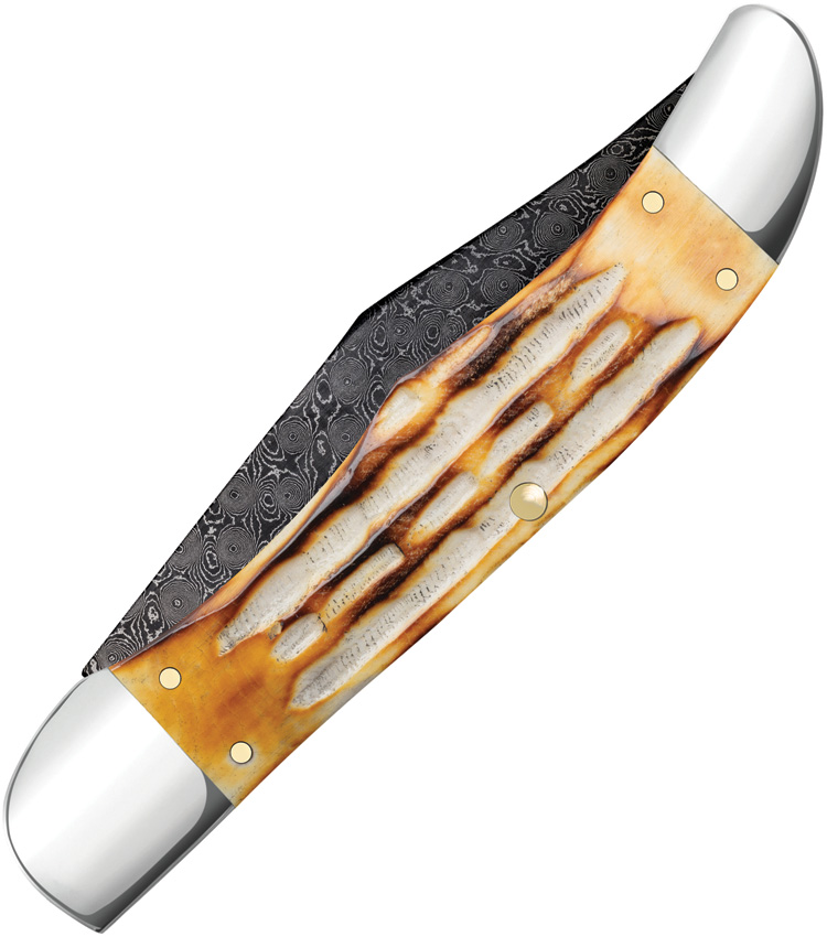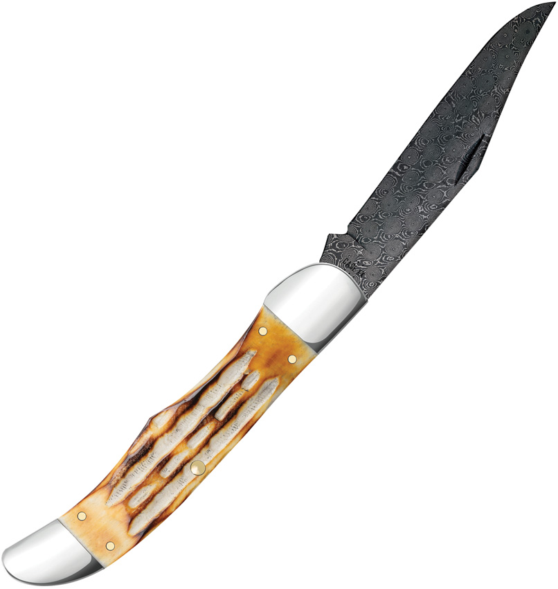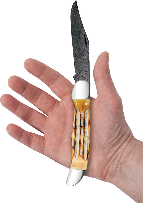 6165 DAM pattern. 5.25″ (13.34cm) closed. Damascus steel clip blade. Burnt Deep Canyon jigged bone handle. Nickel silver bolster(s). Boxed.