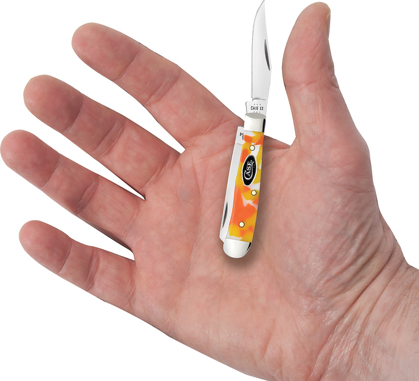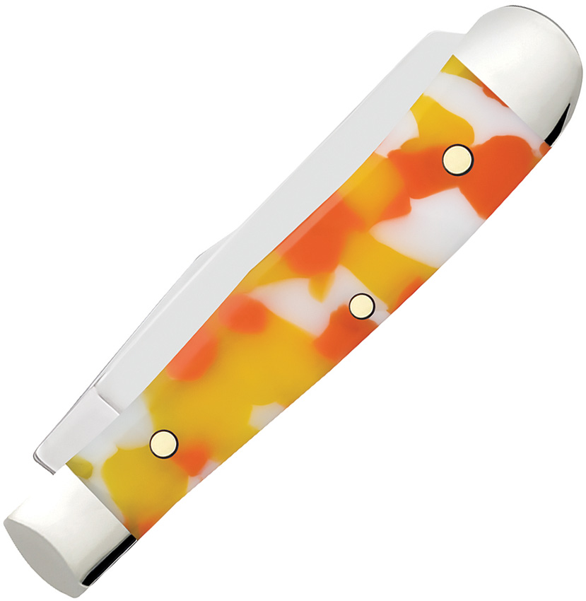 102154 SS pattern. 2.38″ (6.05cm) closed. Mirror finish stainless clip and spey blades. Candy Corn Kirinite handle. Nickel silver bolster(s). Inlay shield.