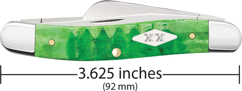 6318 SS pattern. 3.63″ (9.22cm) closed. Mirror finish stainless clip, sheepsfoot, and spey blades. Green Gator jigged bone handle. Nickel silver bolster(s). Inlay shield.