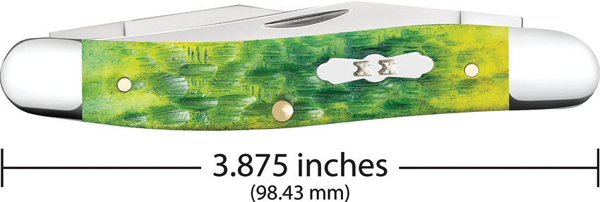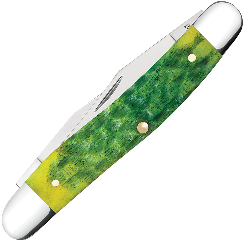 MUSKRAT SS pattern. 3.88″ (9.86cm) closed. Mirror finish stainless dual clip blade. Green apple peach seed jigged bone handle. Nickel silver bolster(s). Inlay shield. Boxed.