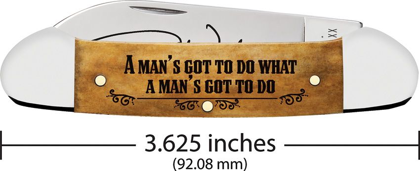 62131 SS pattern. 3.63″ (9.22cm) closed. Mirror finish stainless spear and pen blades. Antique smooth bone handle. Nickel silver bolster(s). Blade etching. John Wayne handle artwork. Boxed.