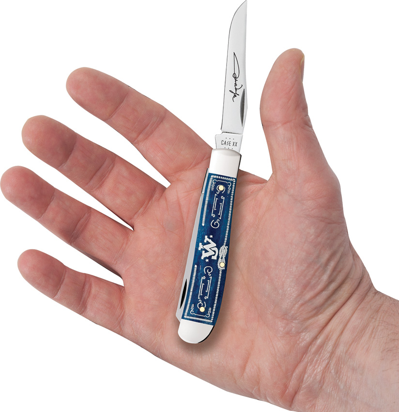 6207 SS pattern. 3.5″ (8.89cm) closed. Mirror finish stainless clip and spey blades. Blue bone handle. Nickel silver bolster(s). Blade etching. John Wayne handle embellishment. Boxed.