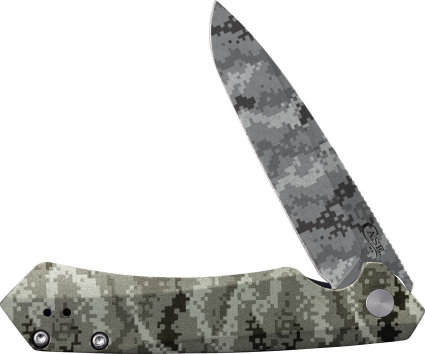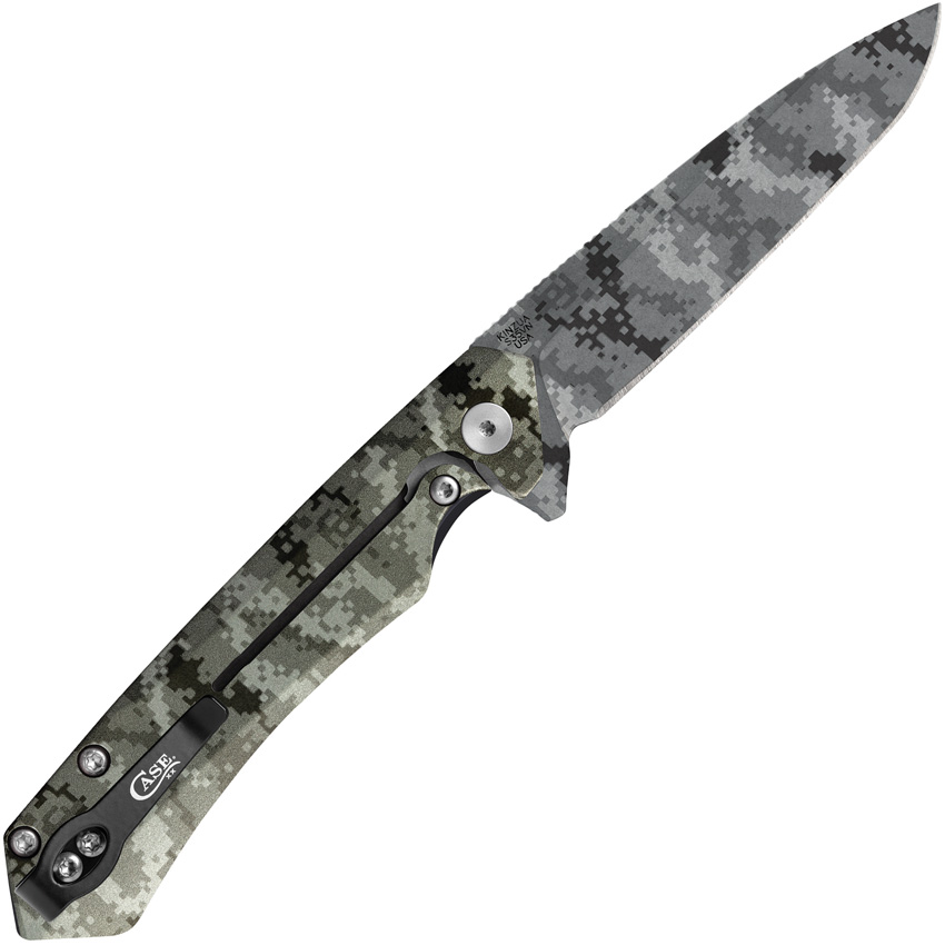 KINZUA S35VN pattern. 4.75″ (12.07cm) closed. 3.75″ (9.53cm) S35VN stainless spear point blade. OD green anodized aluminum handle. Extended tang. Pocket clip. Digital camo pattern on blade and handle. Boxed.