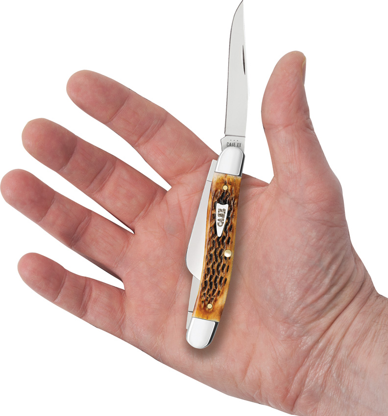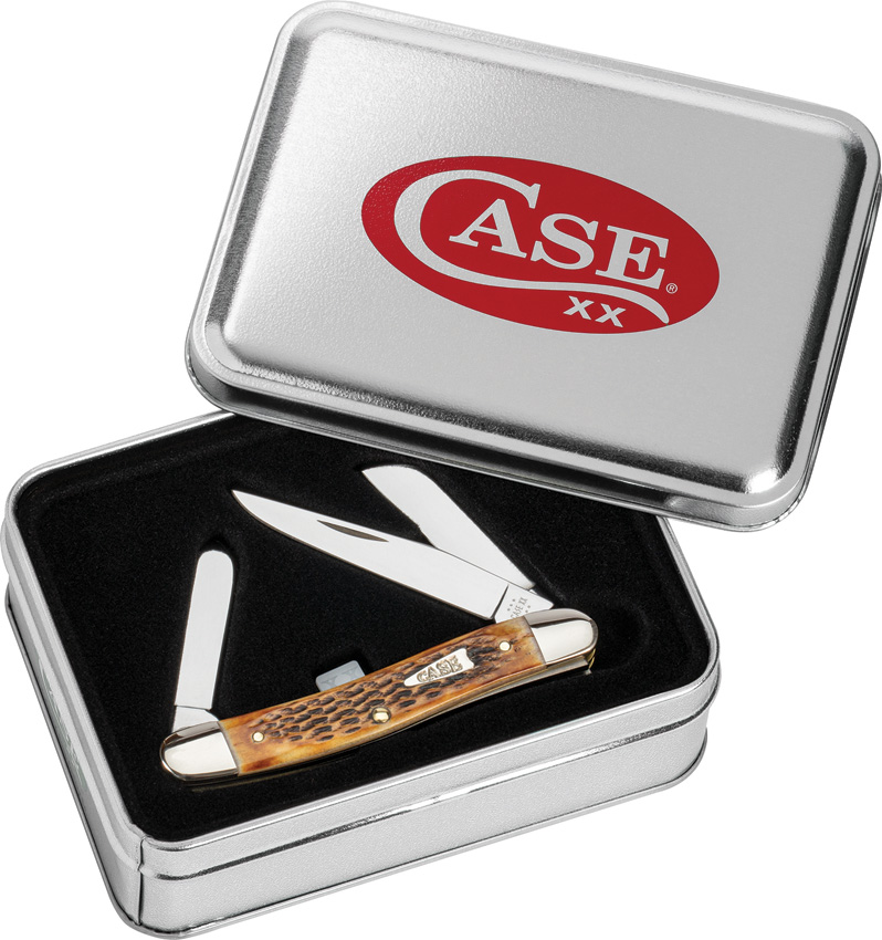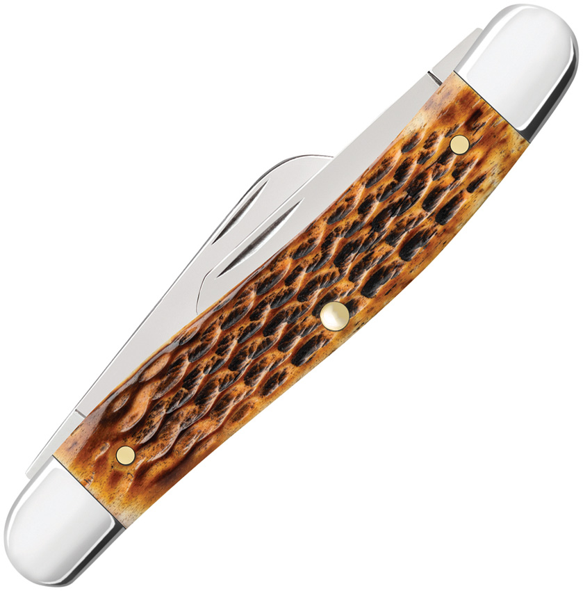 6318 SS pattern. 3.63″ (9.22cm) closed. Mirror finish stainless clip, sheepsfoot, and spey blades. Amber jigged bone handle. Nickel silver bolster(s). Inlay shield. Gift tin.