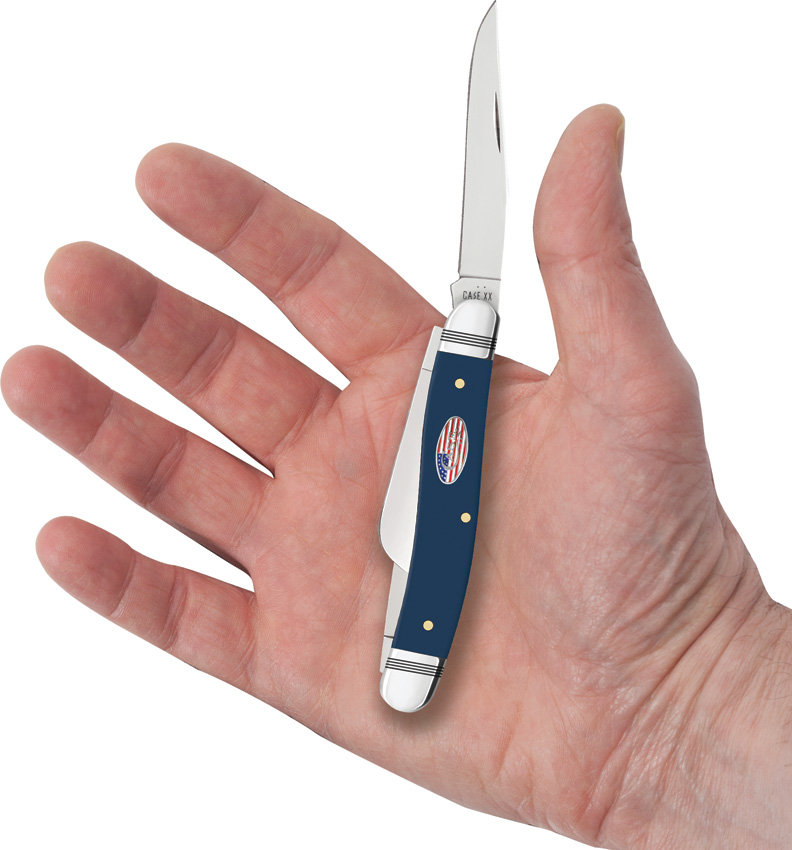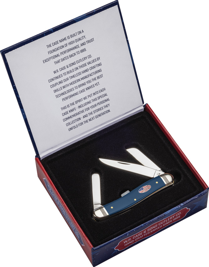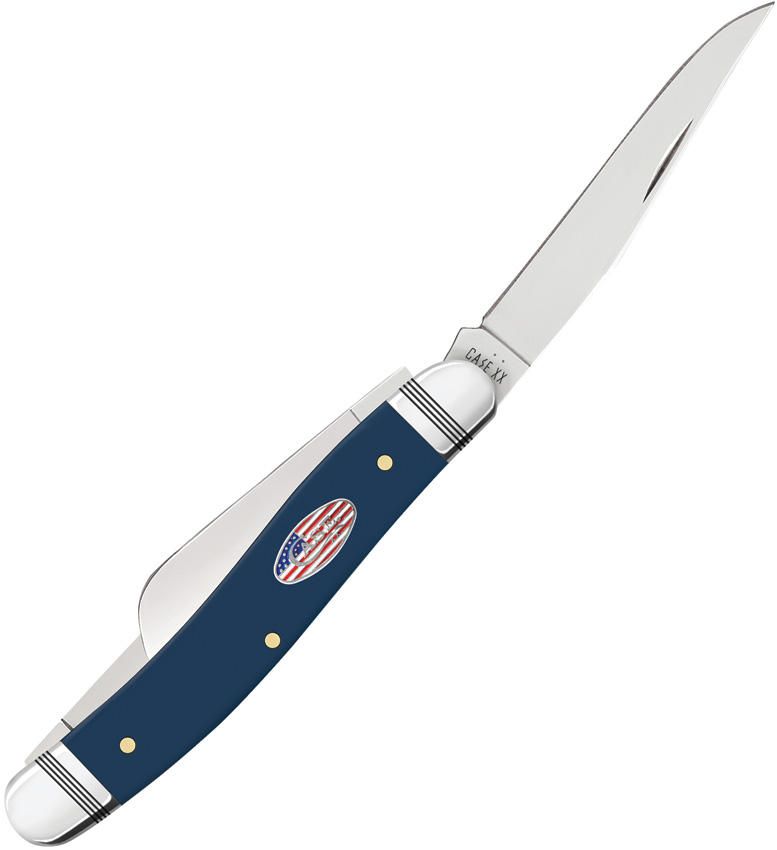 6318 SS pattern. 3.63″ (9.22cm) closed. Mirror finish stainless clip, sheepsfoot, and spey blades. Navy Blue smooth synthetic handle. Nickel silver bolster(s). Inlay shield. Cigar box. Boxed.