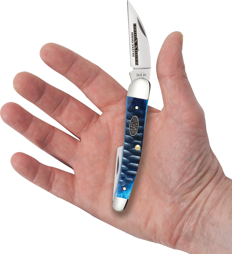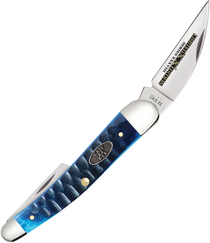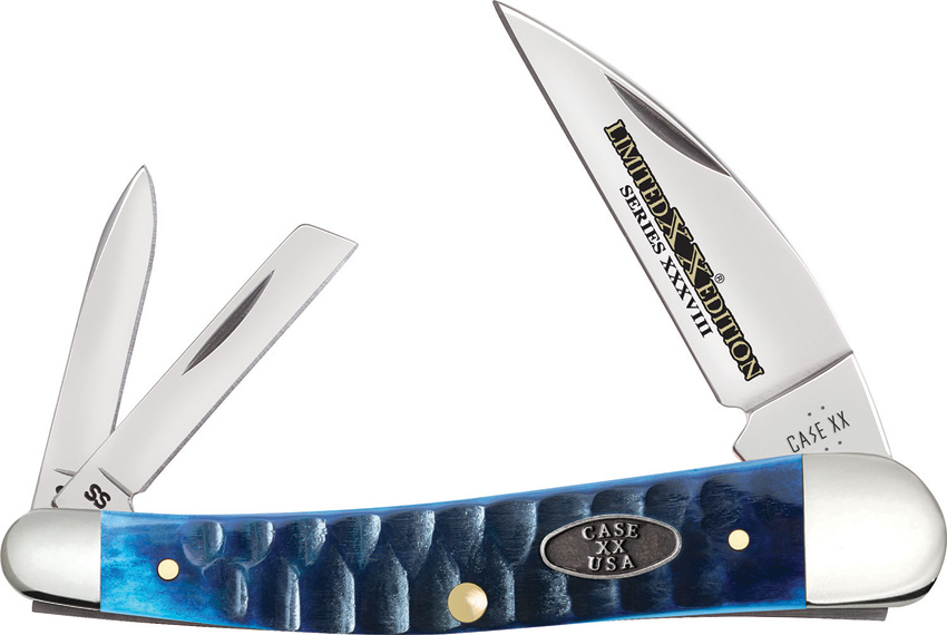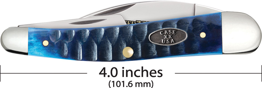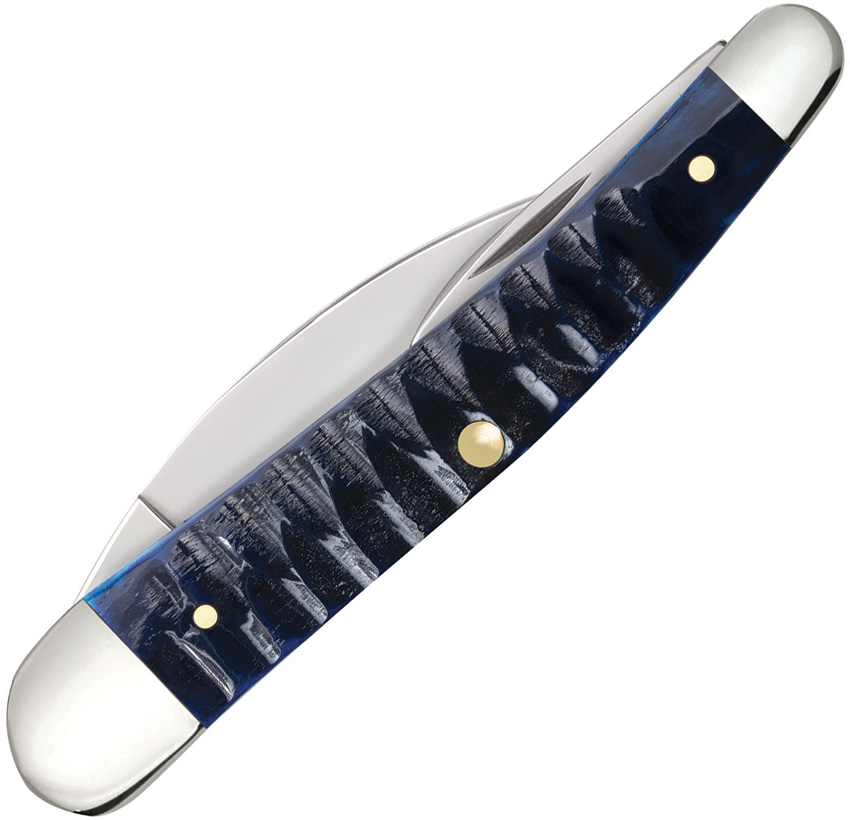 6355WH SS pattern. 4″ (10.16cm) closed. Mirror finish stainless Wharncliffe, pen, and coping blades. Ocean Blue Gator jigged bone handle. Nickel silver bolster(s). Blade etching. Inlay shield. Boxed.