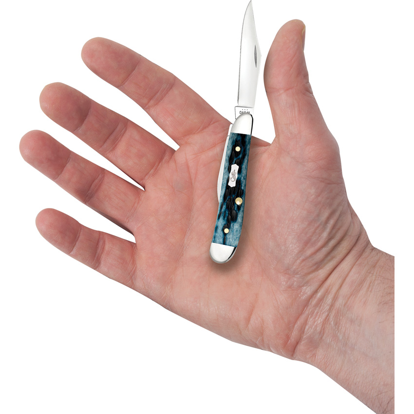 6220 SS pattern. 2.88″ (7.32cm) closed. Mirror finish stainless clip and pen blades. Pocket Worn Mediterranean blue jigged bone handle. Nickel silver bolster(s). Inlay shield. Boxed.