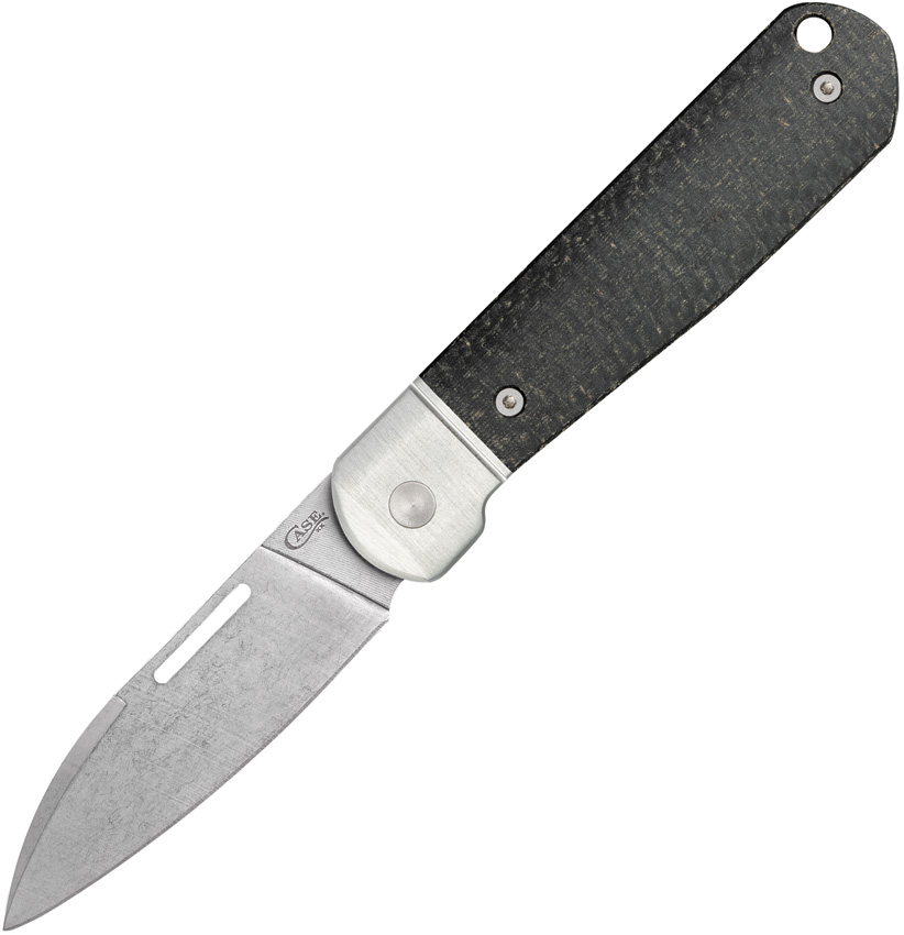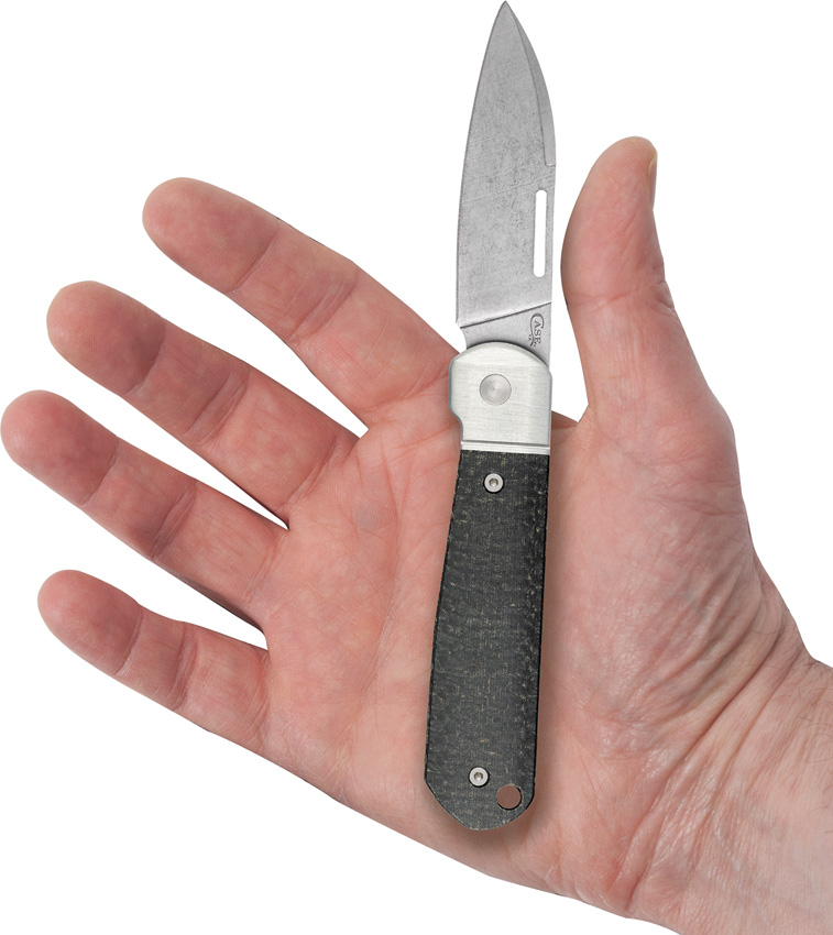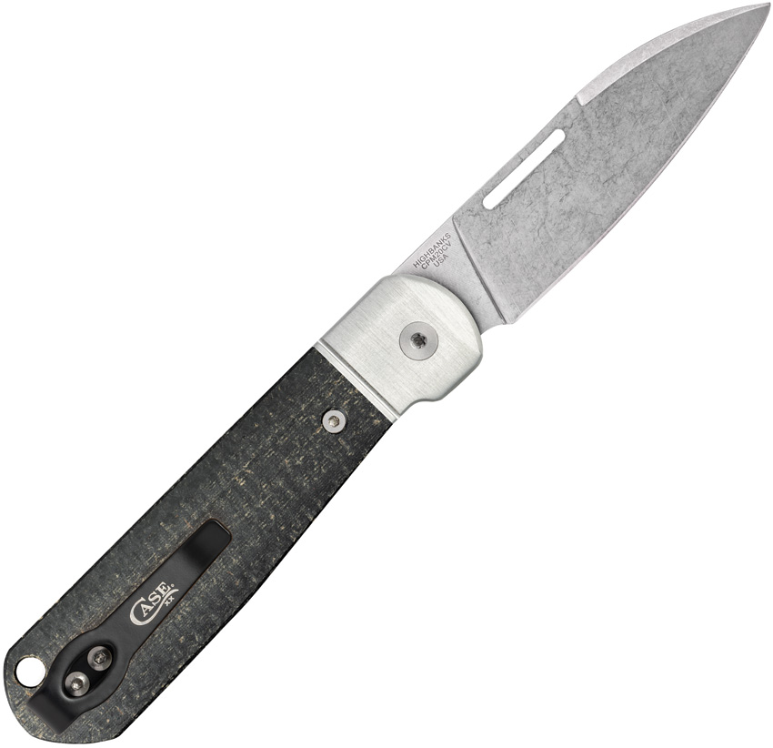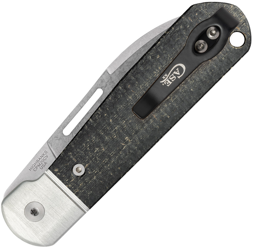 HIGHBANKS. 4″ (10.16cm) closed. Stonewash finish CPM-20CV stainless modified Wharncliffe blade. Black burlap smooth micarta handle. Stainless bolster(s). Pocket clip. Lanyard hole. Boxed.