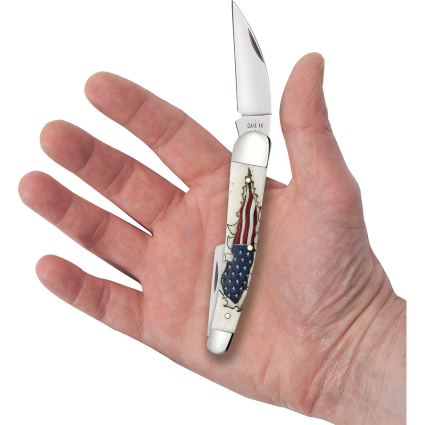 6355WH SS pattern. 4″ (10.16cm) closed. Mirror finish stainless Wharncliffe, pen, and coping blades. Natural smooth bone handle. Nickel silver bolster(s). Flag handle embellishment. Boxed.
