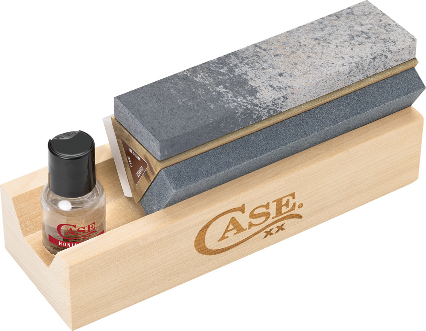 Includes (3) 6″ stones: Aluminum oxide; Soft Arkansas; Hard Arkansas. 1 oz. Honing oil. Wooden base. Boxed.