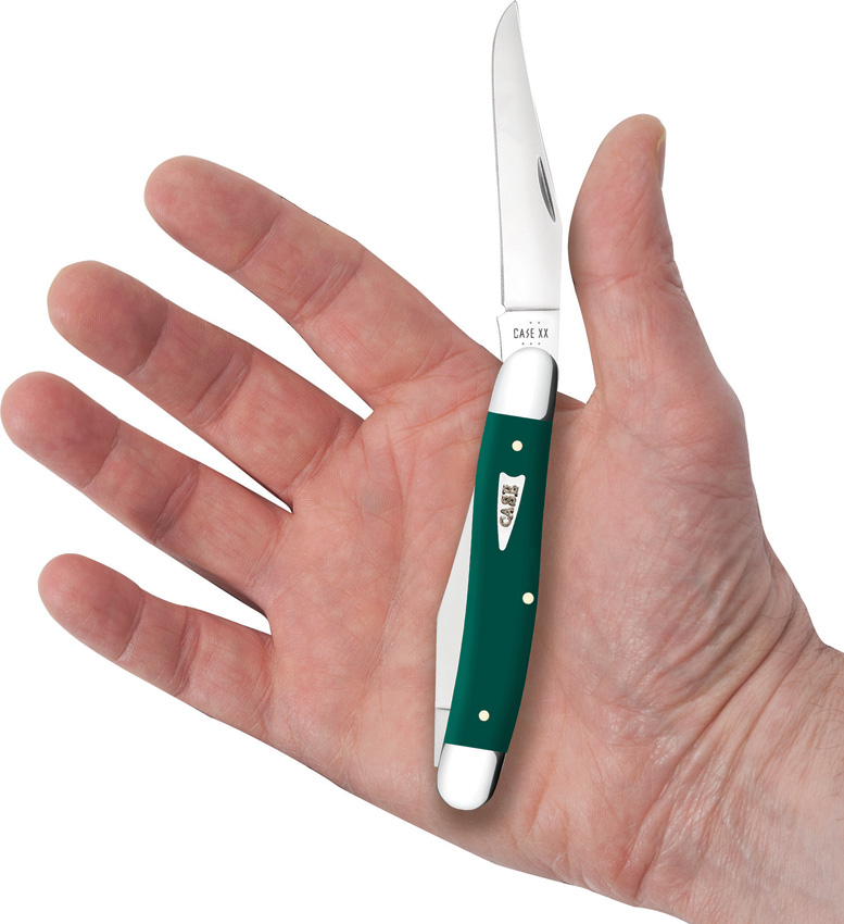 MUSKRAT SS pattern. 3.88″ (9.86cm) closed. Mirror finish stainless dual clip blade. Spruce green smooth synthetic handle. Nickel silver bolster(s). Inlay shield. Boxed.