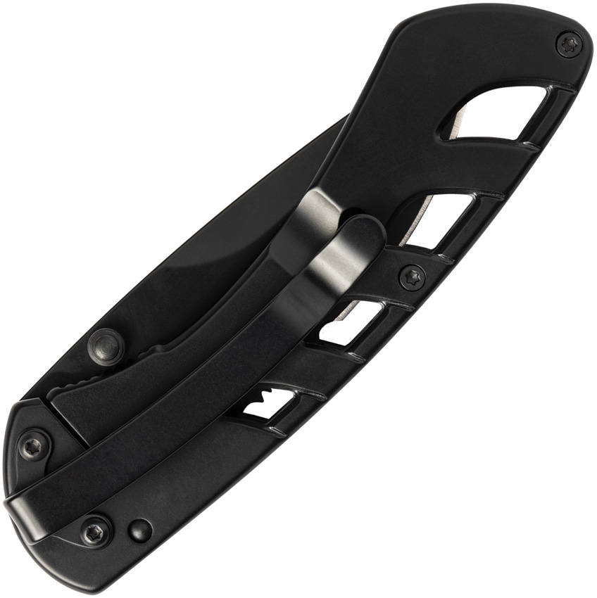4″ (10.16cm) closed. 3″ (7.62cm) black finish partially serrated 440 stainless blade. Black skeletonized stainless handle. Thumb stud. Boxed.
