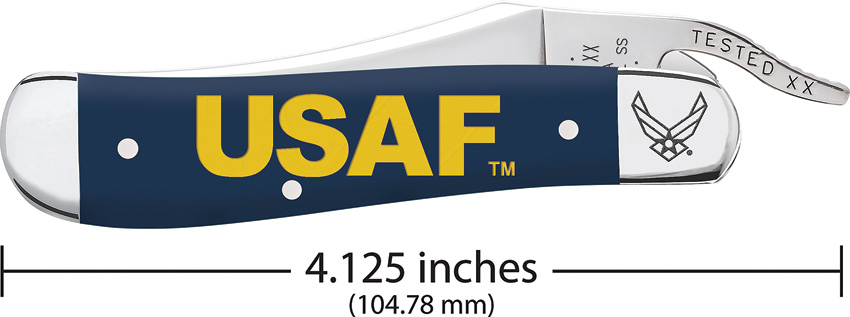 41953L SS pattern. 4.25″ (10.8cm) closed. Mirror finish stainless one hand opening clip blade. Navy Blue smooth synthetic handle. Nickel silver bolster(s). Extended tang. U. S. Air Force handle embellishment. Boxed.