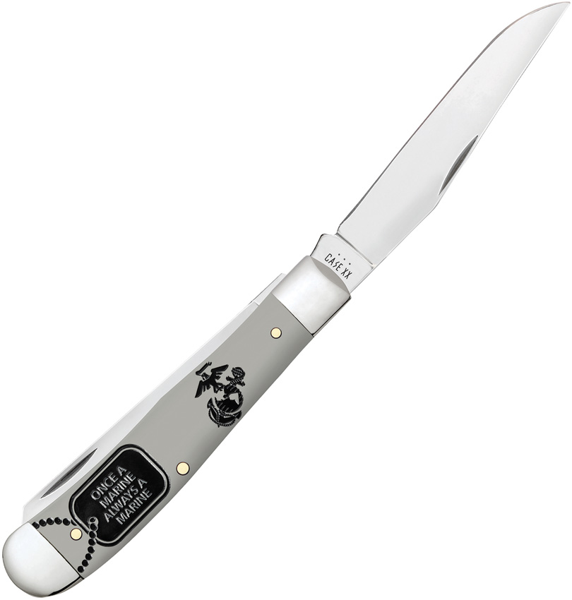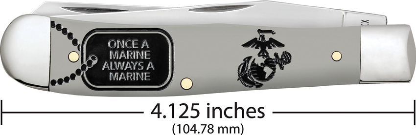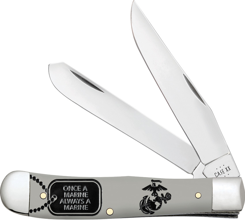 4254 SS pattern. 4.13″ (10.49cm) closed. Mirror finish stainless clip and spey blades. Gray smooth synthetic handle. Nickel silver bolster(s). USMC handle embellishment. Boxed.