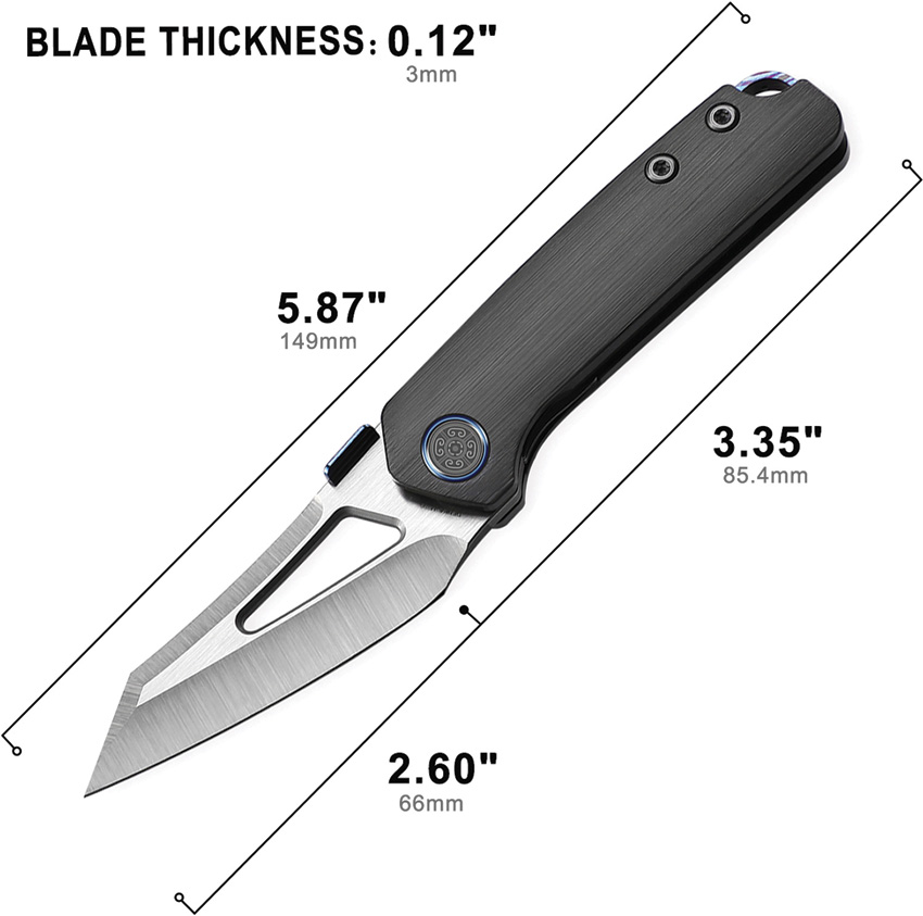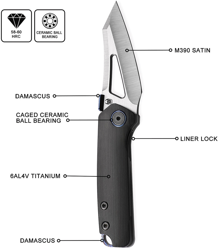 3.25″ (8.26cm) closed. 2.63″ (6.68cm) satin finish Bohler M390 stainless blade. Black titanium handle. Thumb disk. Lanyard hole. Pocket clip. Boxed.