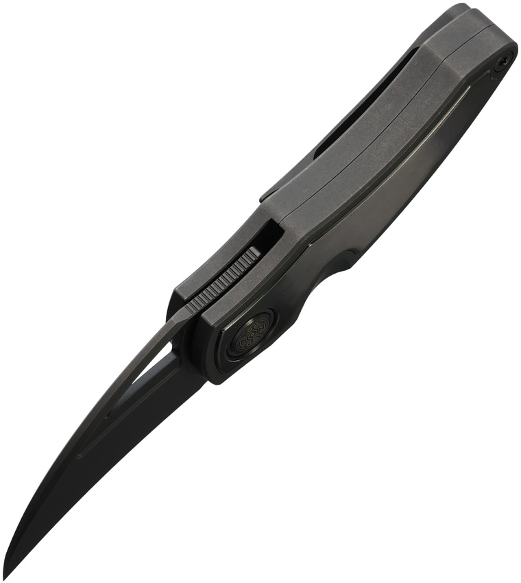 3.5″ (8.89cm) closed. 2.13″ (5.41cm) black PVD coated Bohler M390 stainless blade. Black titanium handle with Black mirror titanium inlay. Thumb pull. Pocket clip. Extended tang. Boxed.